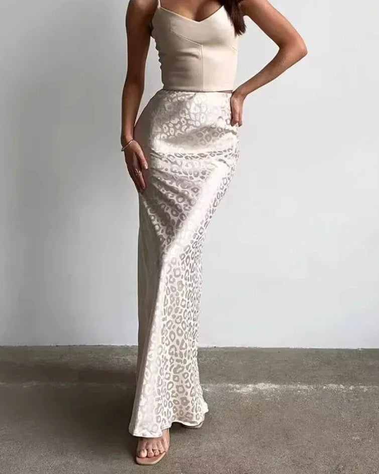Elevate your wardrobe with this luxurious satin maxi skirt, featuring a subtle yet eye-catching leopard print that balances bold style and elegance. Crafted from smooth, lustrous satin fabric, it drapes beautifully and adds a soft sheen to any outfit. The high-waisted, body-hugging silhouette accentuates curves, while the full-length cut (with a slight slit for mobility) creates a sleek, glamorous look. Perfect for cocktail parties, dinner dates, or dressed-up casual events—pair it with camisoles, blazers, or knit tops. Available in soft beige, classic black, and rich taupe, in sizes S to L.
